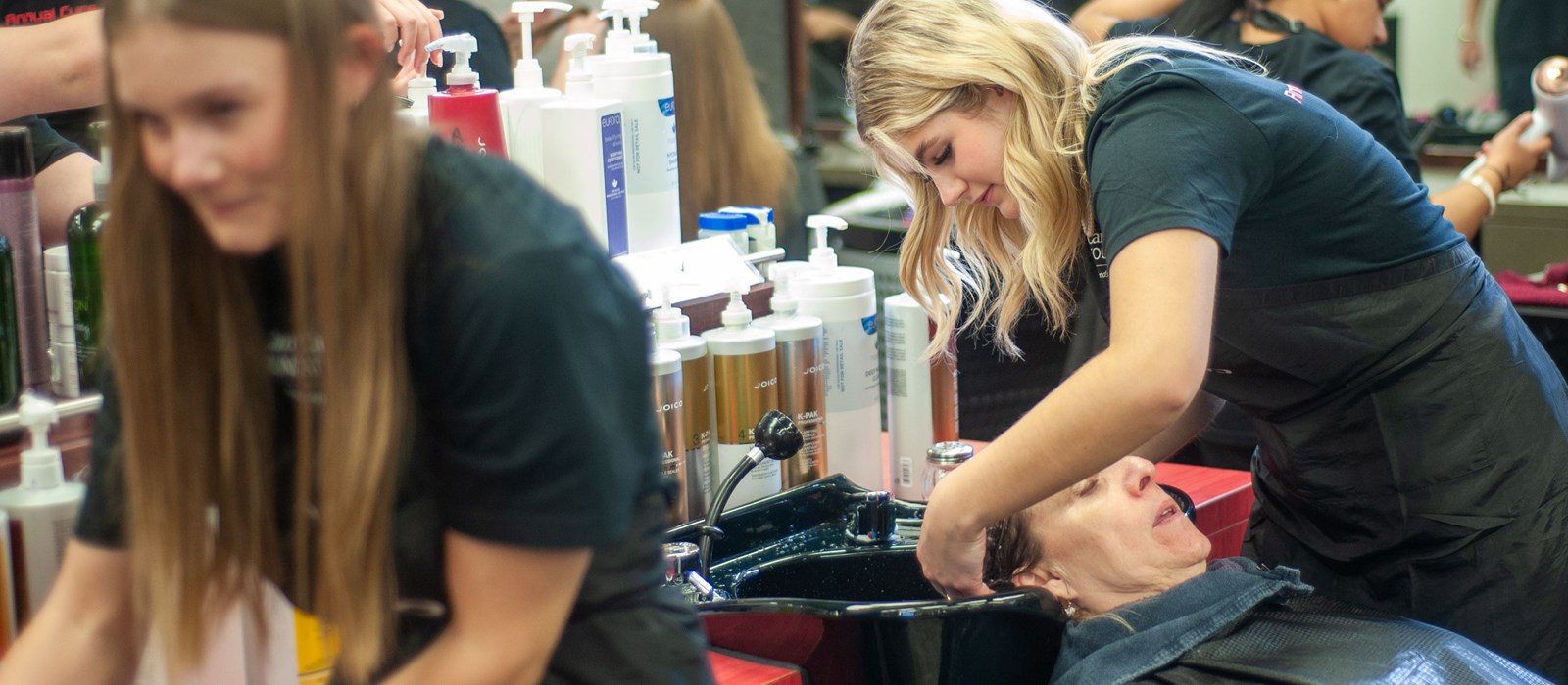 In the ATC Salon, all the styling chairs were full with visitors and each visitor had a student or two tending to them, and large mirrors multiplied their images and made the room feel even more packed. Berhe and classmates were zipping around all day, trying to keep up.
